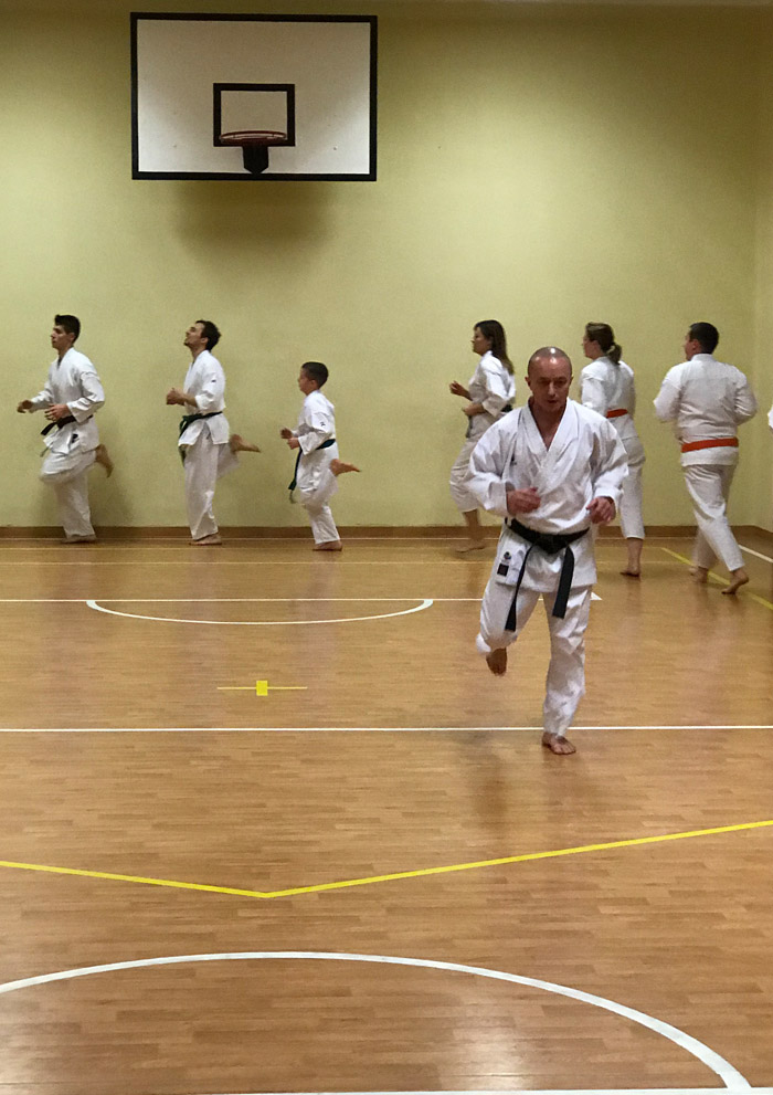 Popołudniowy trening znacznie bardziej wymagający kondycyjnie. Przygotowanie do kumite, poruszanie, ćwiczenia szybkościowe z partnerem, kilka ciekawych kombinacji kihon kumite.