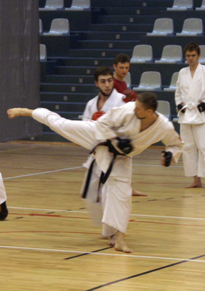 Trening był podzielony na dwie części. W pierwszej z nich pracowaliśmy nad wytrzymałością i sprawnością fizyczną. Natomiast w drugiej skupiliśmy się nad kumite doskonaląc zejścia z linii ataku.